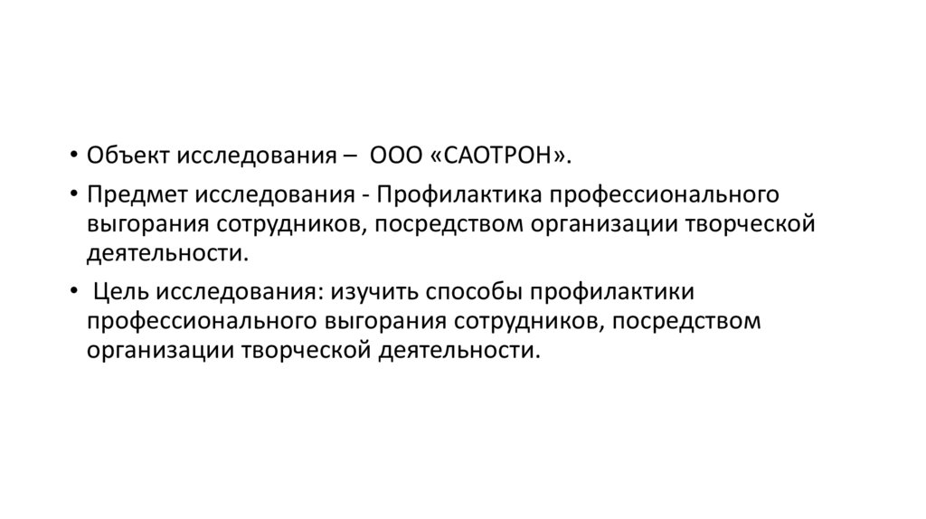 • Объект исследования – ООО «САОТРОН».• Предмет исследования - Профилактика профессионального