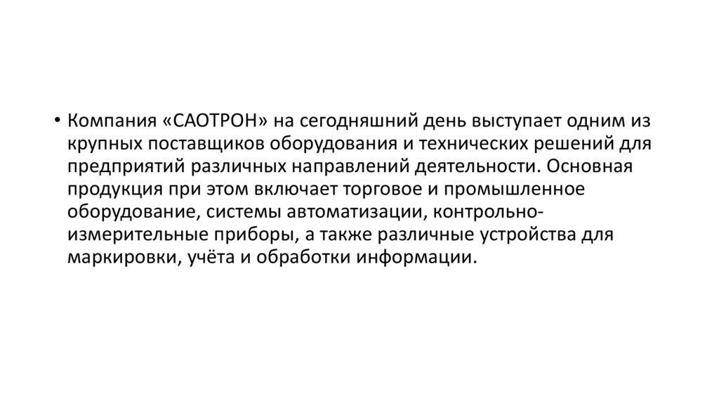 • Компания «САОТРОН» на сегодняшний день выступает одним изкрупных поставщиков оборудования и технических решений для