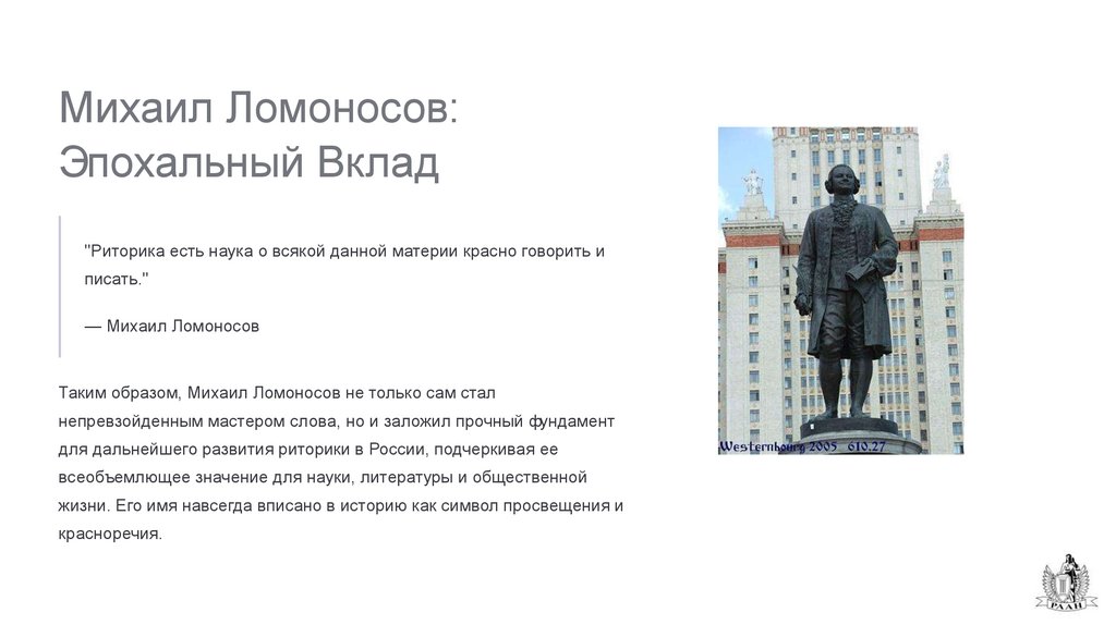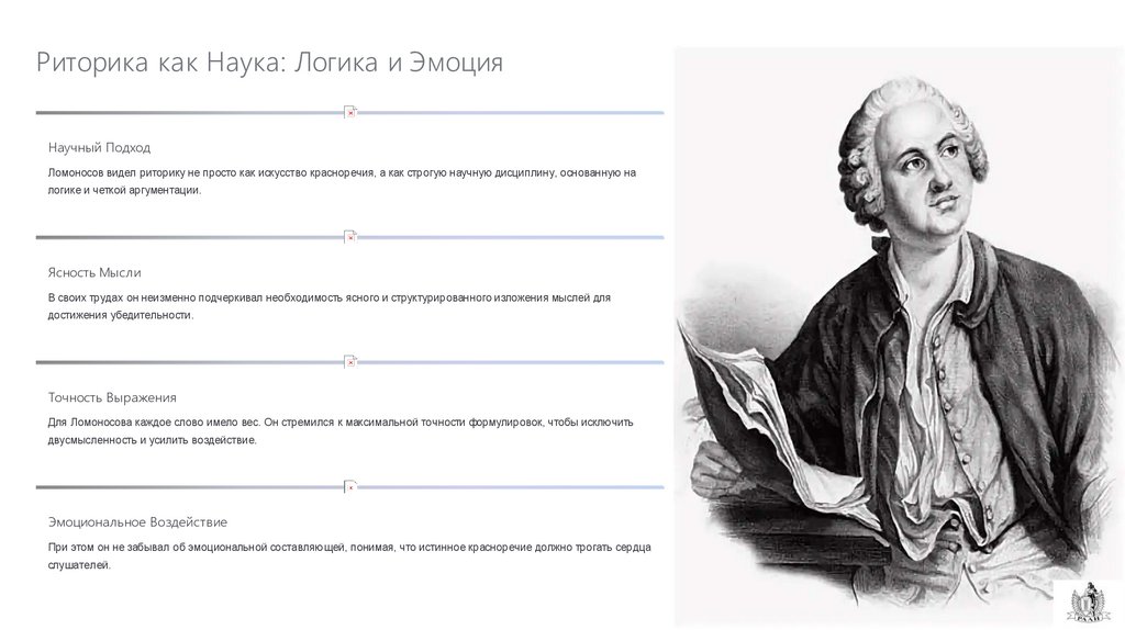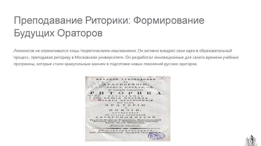 Ломоносов видел риторику не просто как искусство красноречия, а как строгую научную дисциплину, основанную на