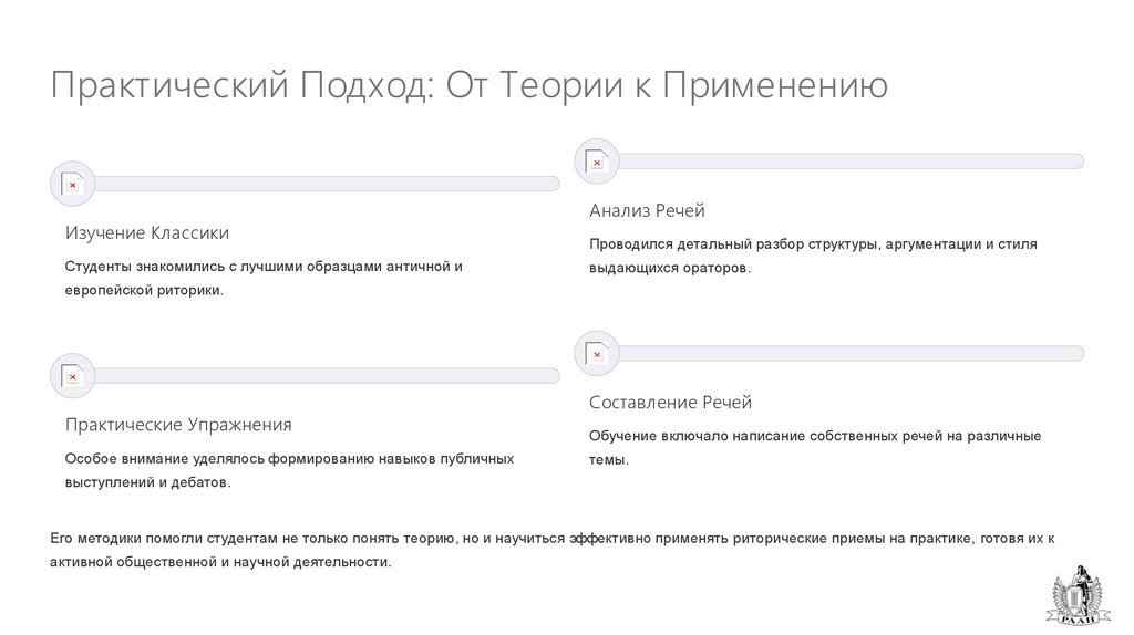 Его методики помогли студентам не только понять теорию, но и научиться эффективно применять риторические приемы на практике, готовя их к