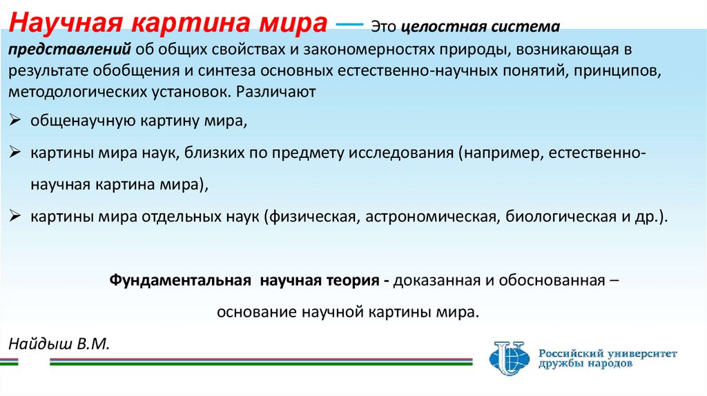 Научная картина мира — Это целостная системапредставлений об общих свойствах и закономерностях природы, возникающая в
