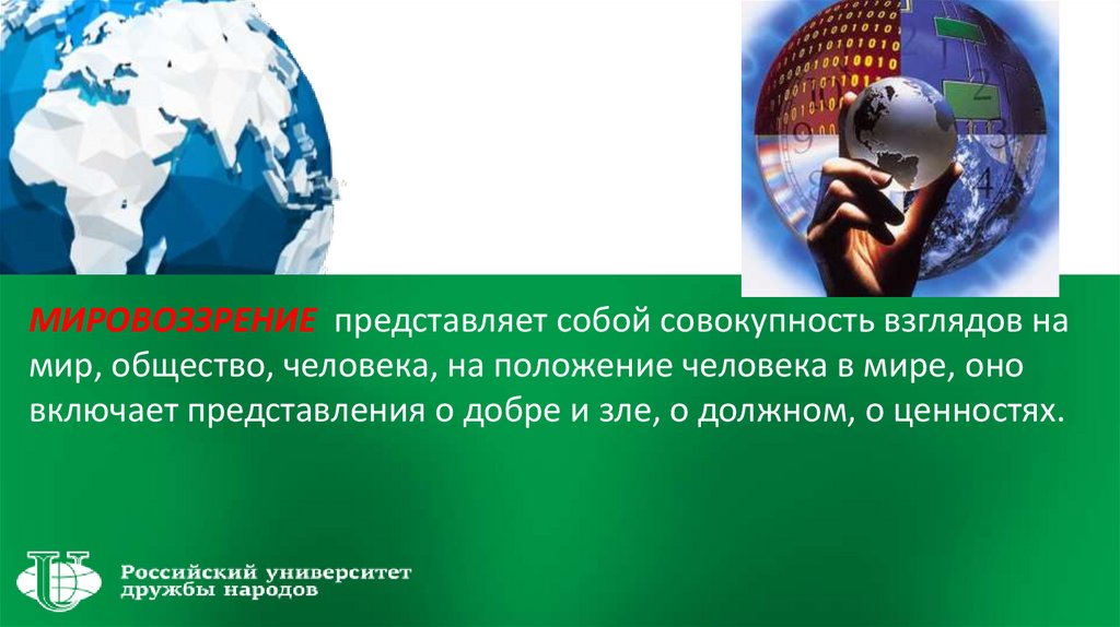 МИРОВОЗЗРЕНИЕ представляет собой совокупность взглядов намир, общество, человека, на положение человека в мире, оно