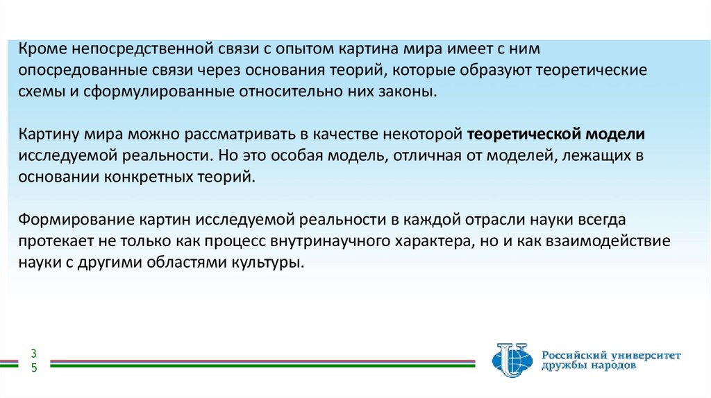 Кроме непосредственной связи с опытом картина мира имеет с нимопосредованные связи через основания теорий, которые образуют теоретические