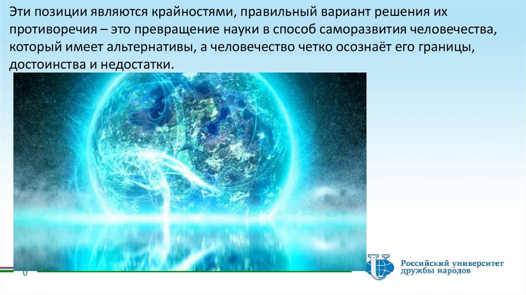 Эти позиции являются крайностями, правильный вариант решения ихпротиворечия – это превращение науки в способ саморазвития человечества,