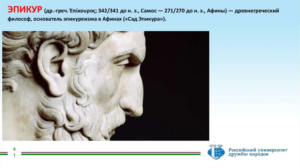 ЭПИКУР (др.-греч. Ἐπίκουρος; 342/341 до н. э., Самос — 271/270 до н. э., Афины) — древнегреческийфилософ, основатель эпикуреизма в Афинах («Сад Эпикура»).