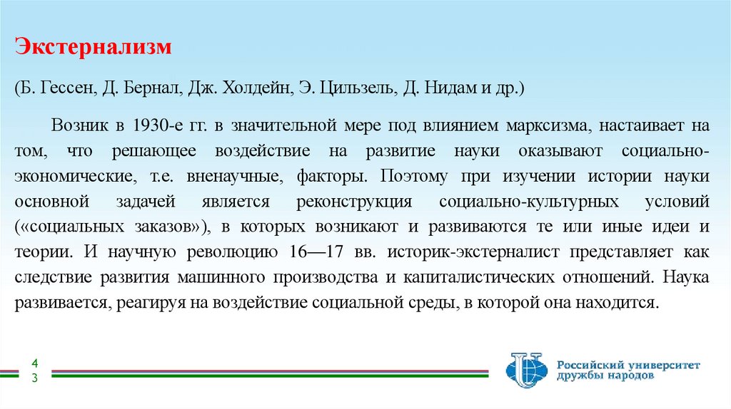 Экстернализм(Б. Гессен, Д. Бернал, Дж. Холдейн, Э. Цильзель, Д. Нидам и др.)