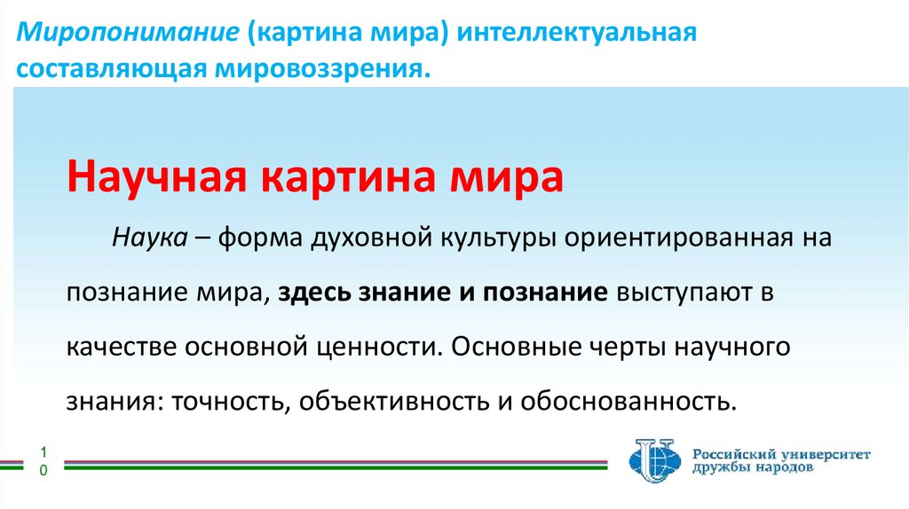 Миропонимание (картина мира) интеллектуальнаясоставляющая мировоззрения.