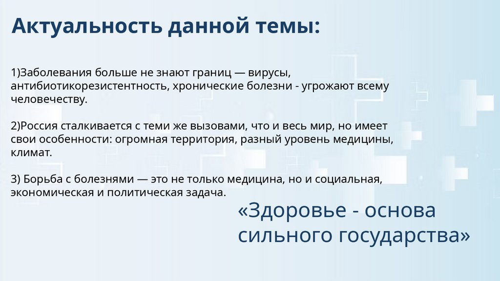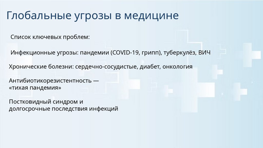 Глобальные угрозы в медицинеСписок ключевых проблем: