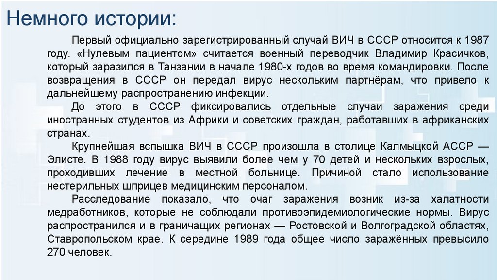 Немного истории:Первый официально зарегистрированный случай ВИЧ в СССР относится к 1987