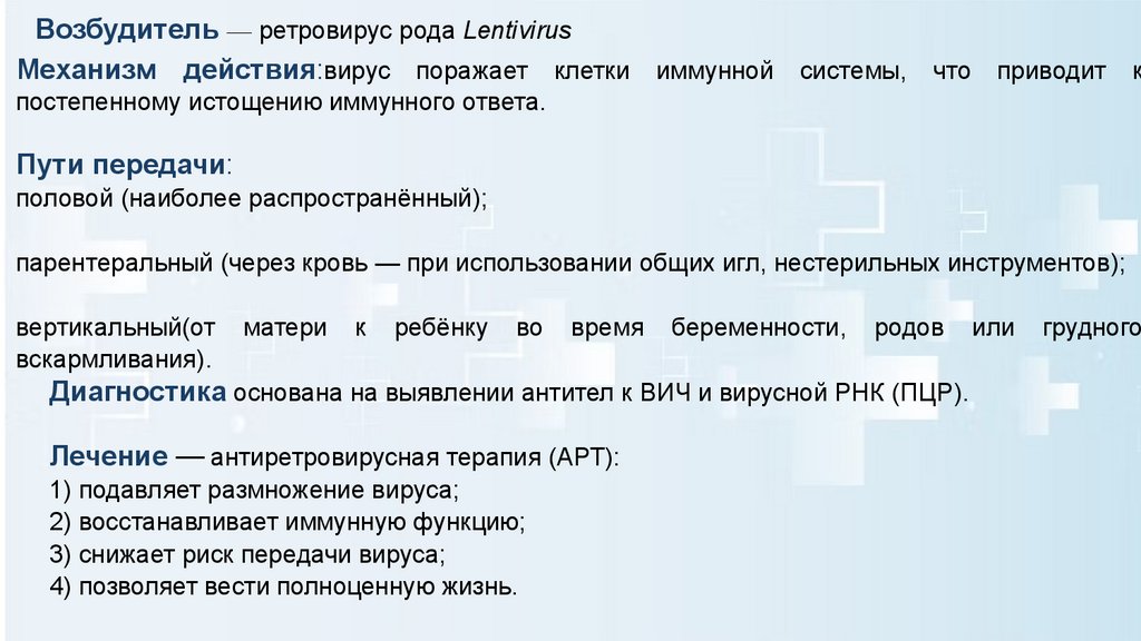 Возбудитель — ретровирус рода LentivirusМеханизм действия:вирус поражает клетки иммунной системы, что приводит к