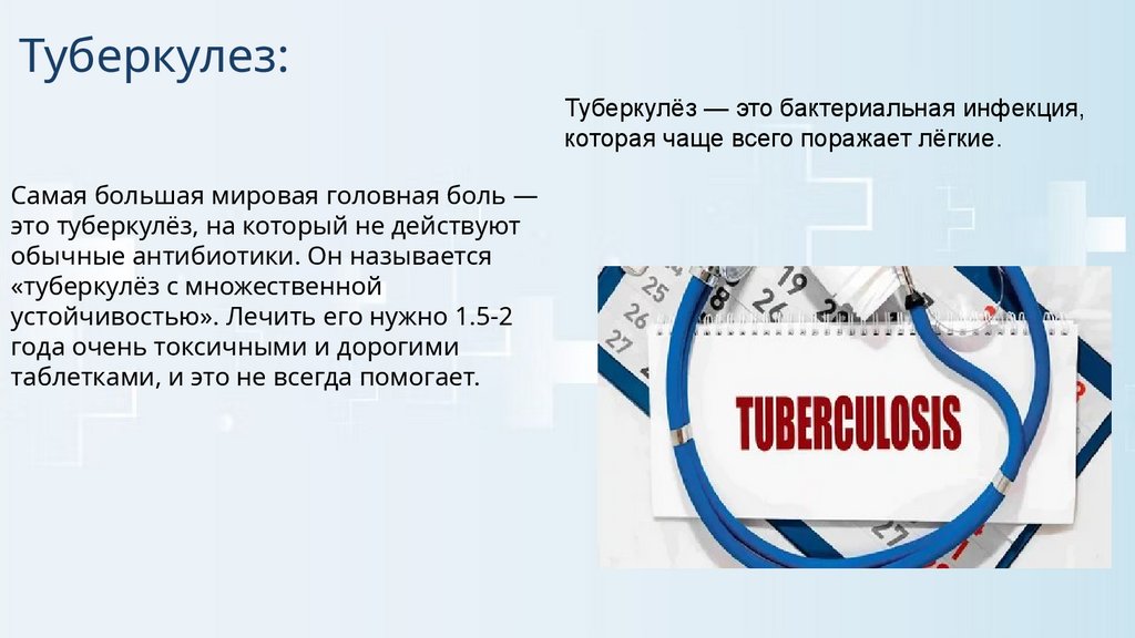 Туберкулез:Туберкулёз — это бактериальная инфекция,