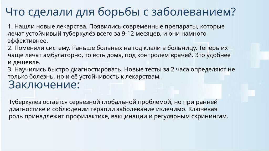 Что сделали для борьбы с заболеванием?1. Нашли новые лекарства. Появились современные препараты, которые