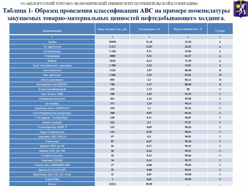 УО «БЕЛОРУССКИЙ ТОРГОВО-ЭКОНОМИЧЕСКИЙ УНИВЕРСИТЕТ ПОТРЕБИТЕЛЬСКОЙ КООПЕРАЦИИ»Таблица 1- Образец проведения классификации АВС на примере номенклатуры
