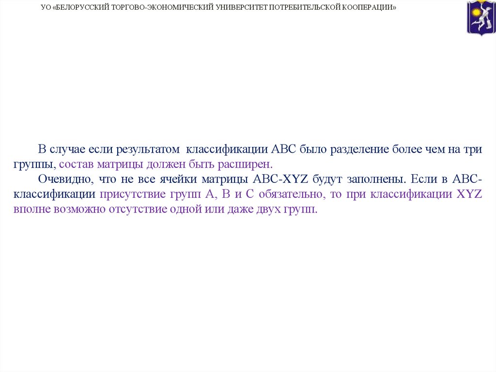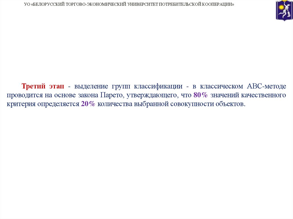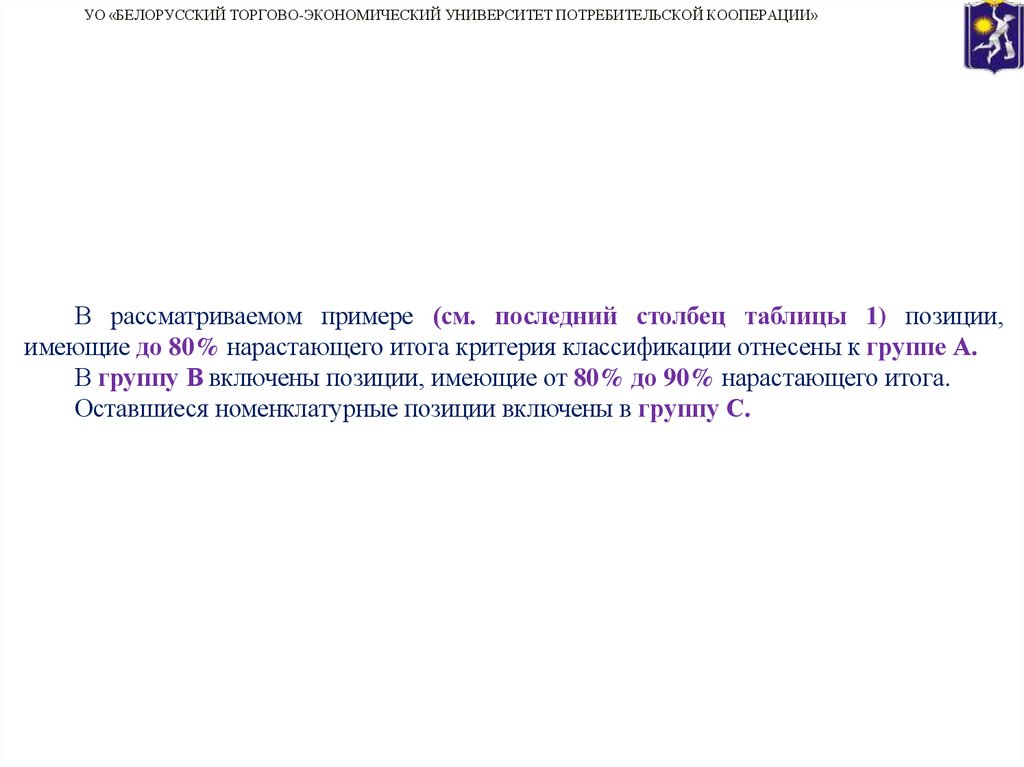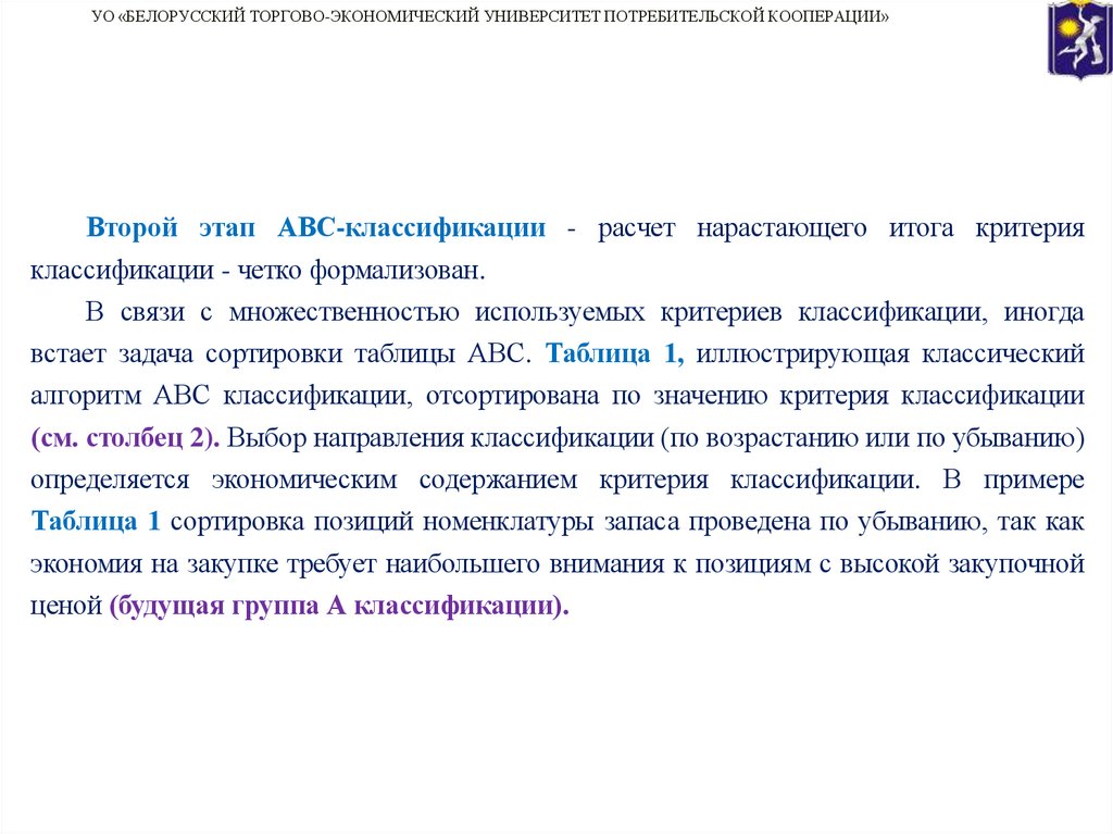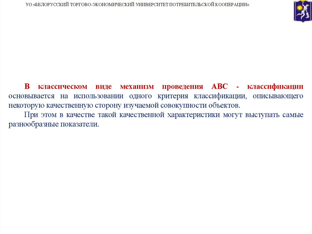 УО «БЕЛОРУССКИЙ ТОРГОВО-ЭКОНОМИЧЕСКИЙ УНИВЕРСИТЕТ ПОТРЕБИТЕЛЬСКОЙ КООПЕРАЦИИ»2. Классический порядок АВС – классификации