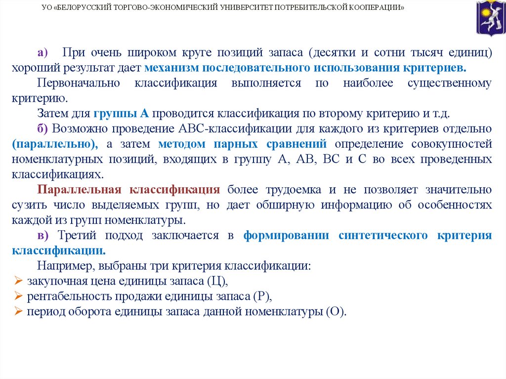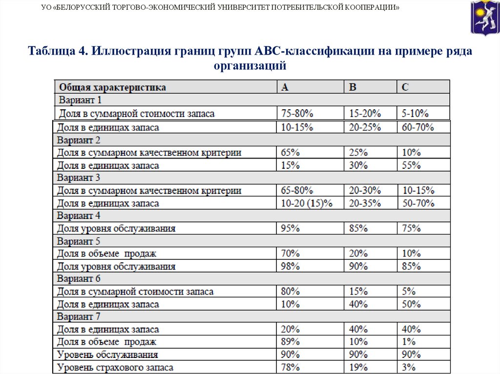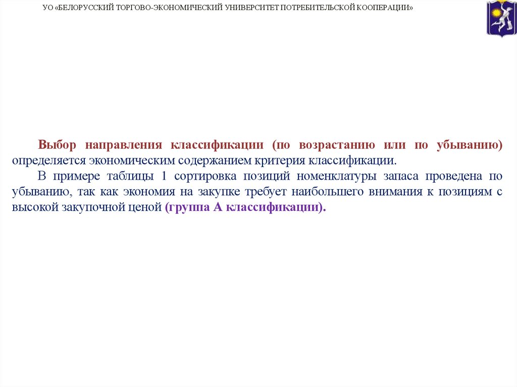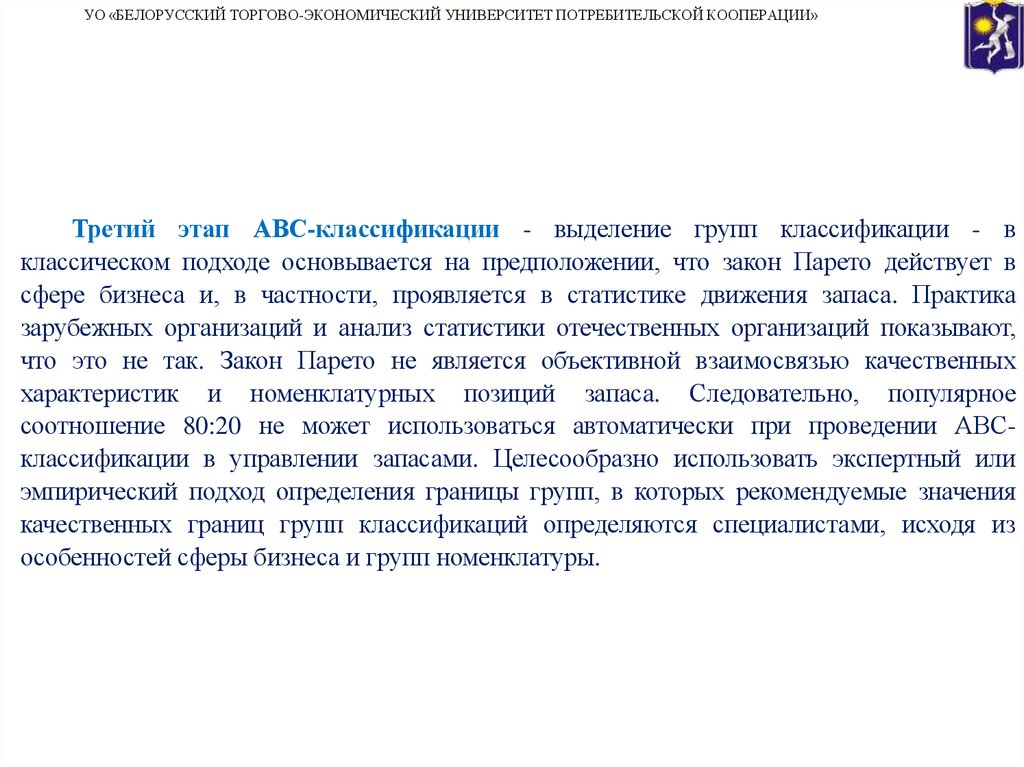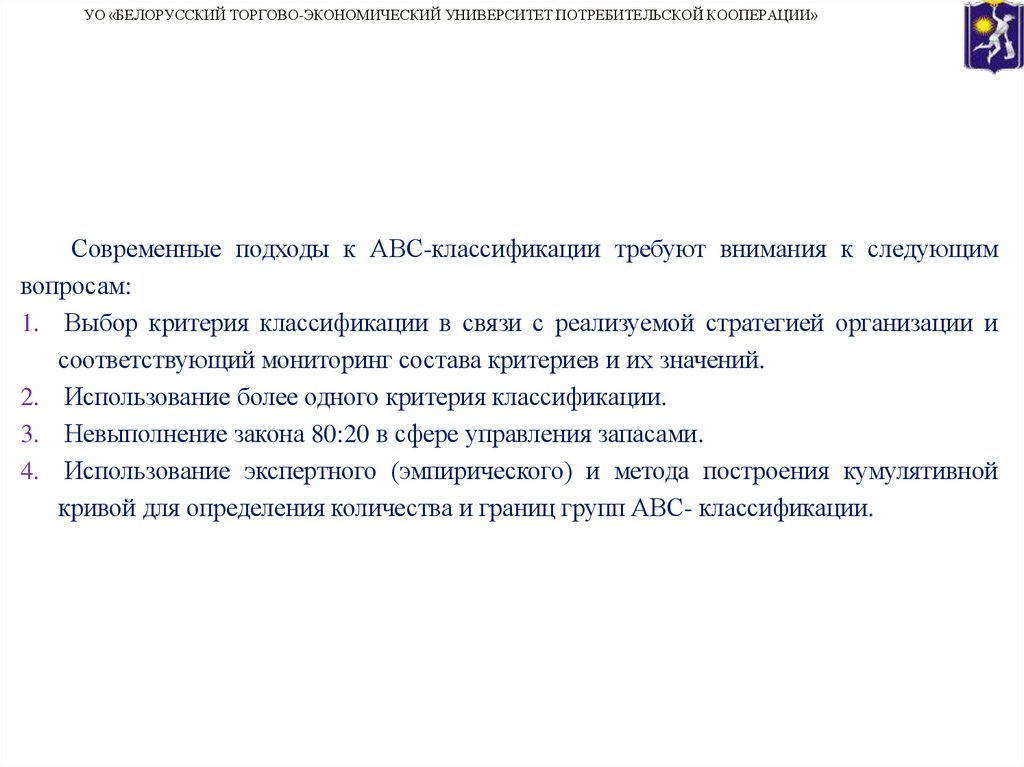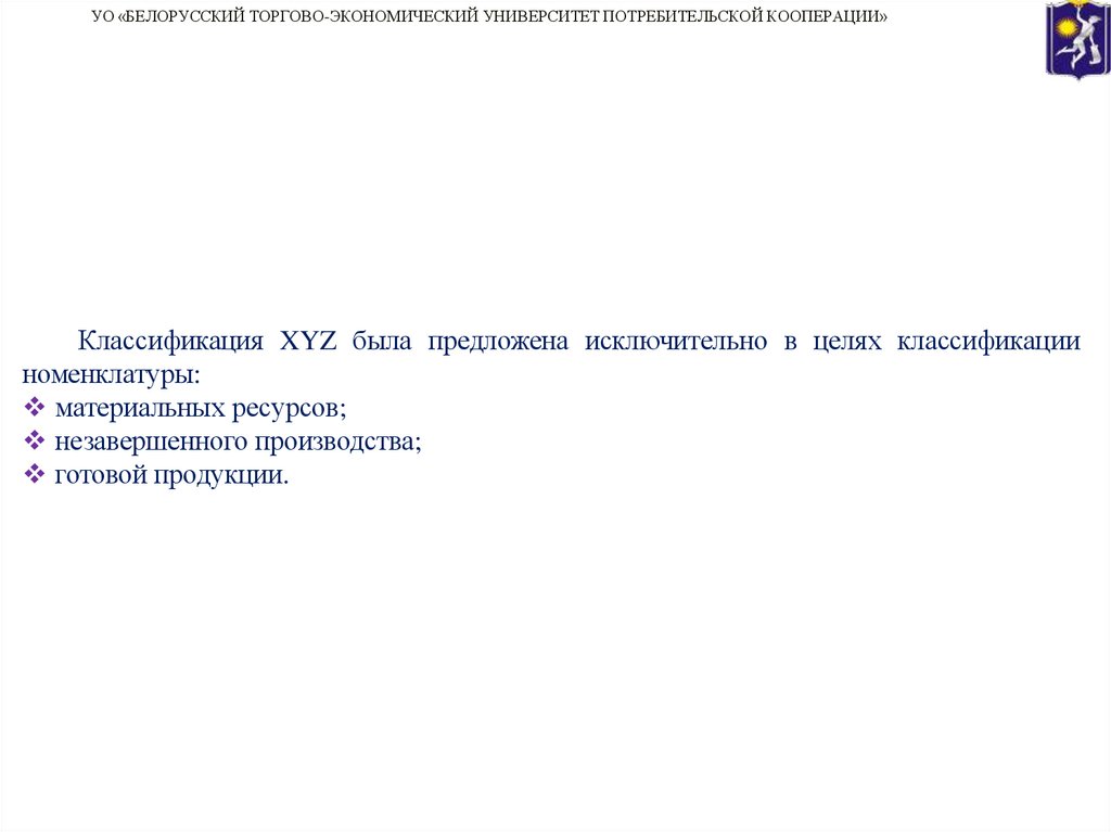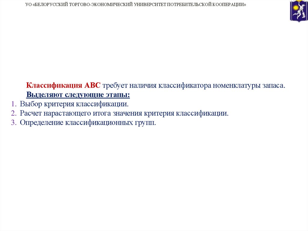 УО «БЕЛОРУССКИЙ ТОРГОВО-ЭКОНОМИЧЕСКИЙ УНИВЕРСИТЕТ ПОТРЕБИТЕЛЬСКОЙ КООПЕРАЦИИ»Классификация АВС требует наличия классификатора номенклатуры запаса.