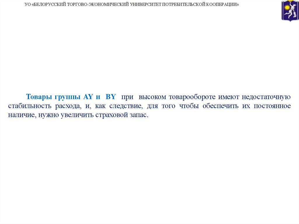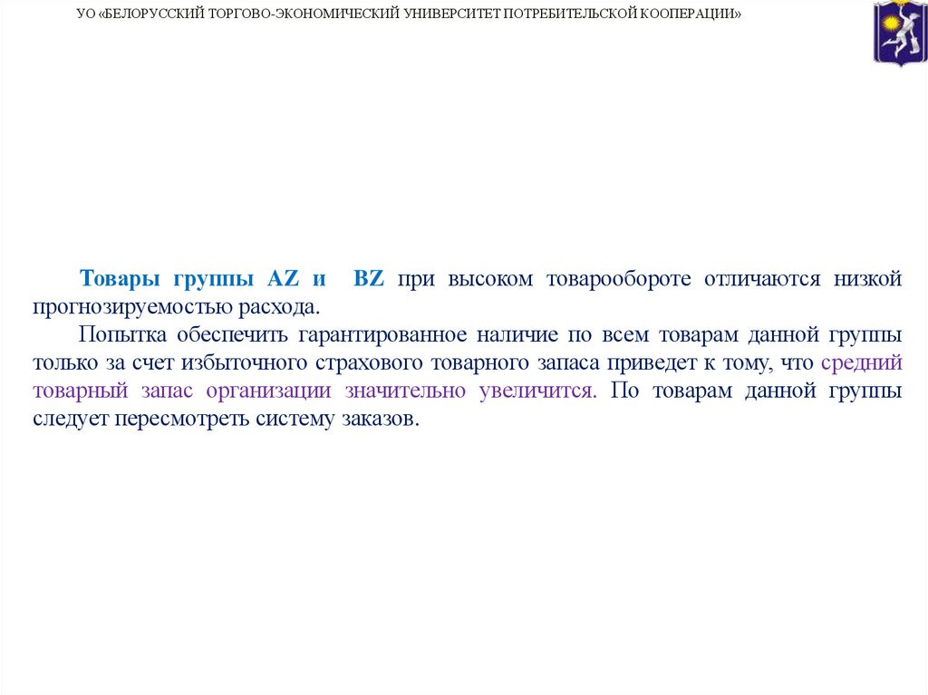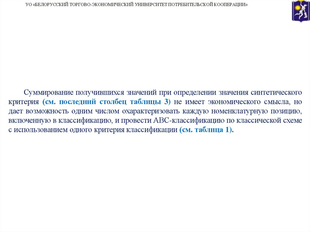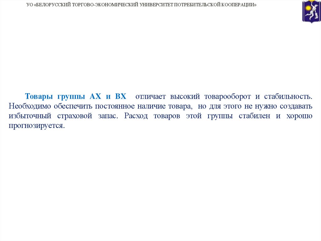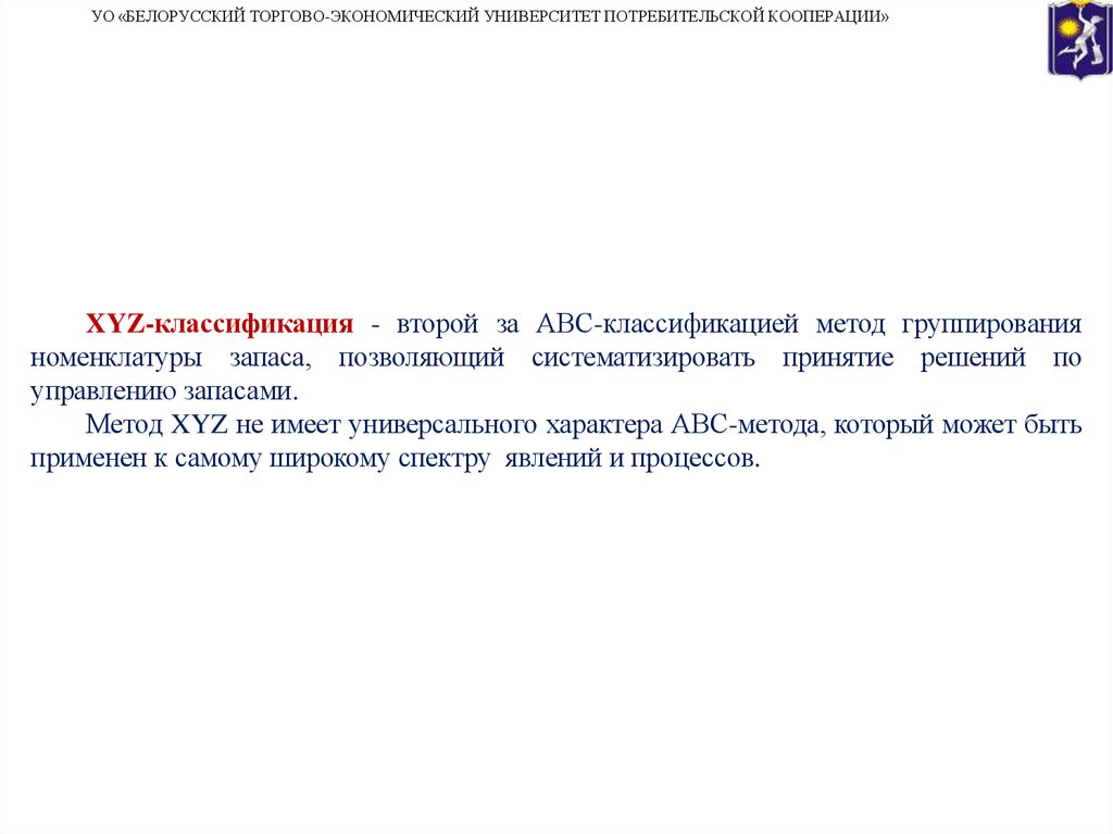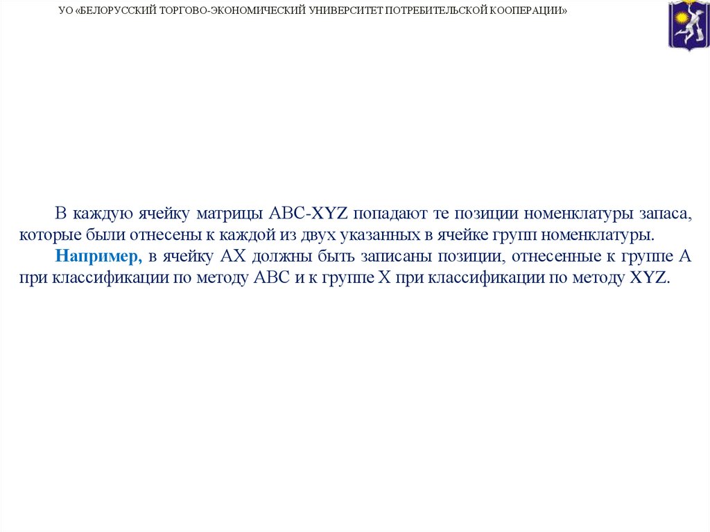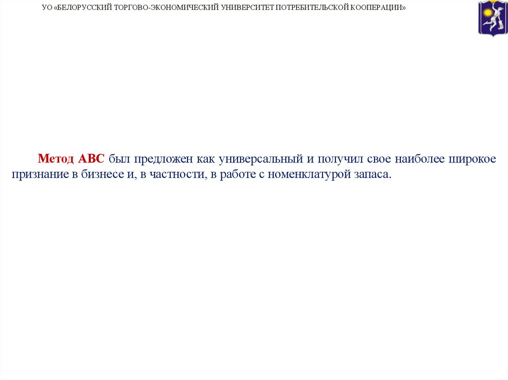 УО «БЕЛОРУССКИЙ ТОРГОВО-ЭКОНОМИЧЕСКИЙ УНИВЕРСИТЕТ ПОТРЕБИТЕЛЬСКОЙ КООПЕРАЦИИ»Классификация АВС требует наличия классификатора номенклатуры запаса.