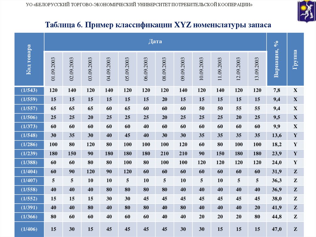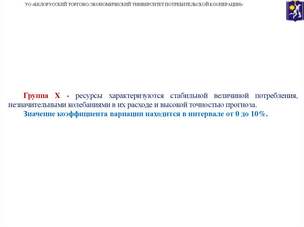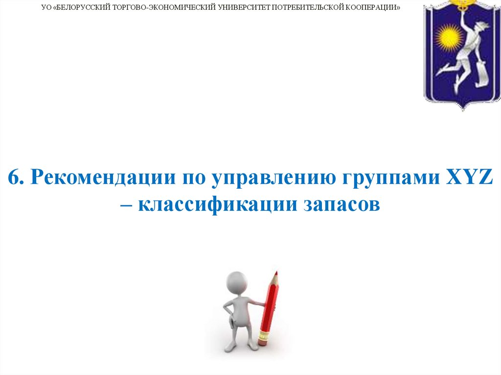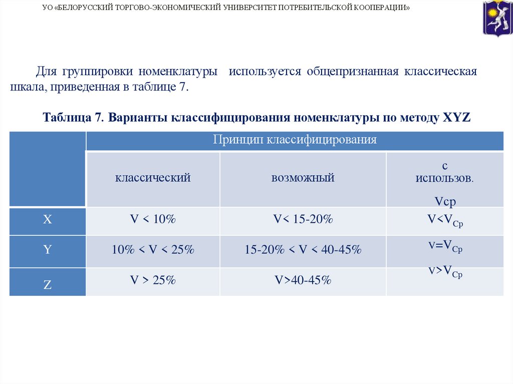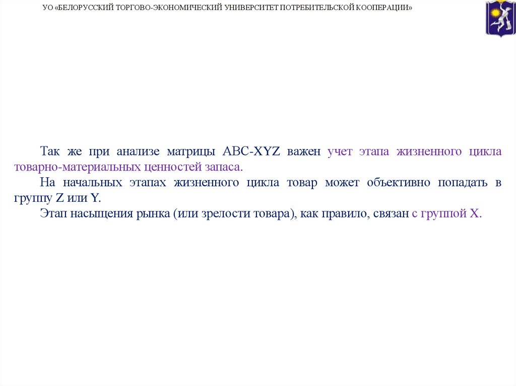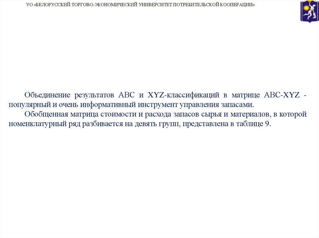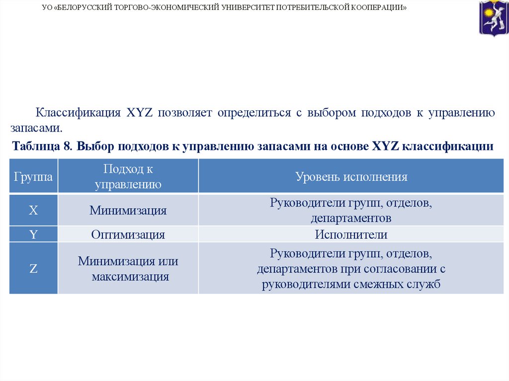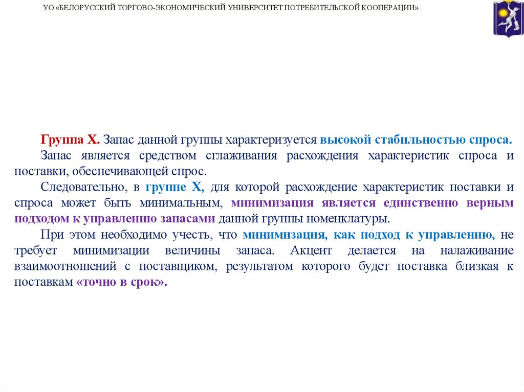 УО «БЕЛОРУССКИЙ ТОРГОВО-ЭКОНОМИЧЕСКИЙ УНИВЕРСИТЕТ ПОТРЕБИТЕЛЬСКОЙ КООПЕРАЦИИ»Классификация АВС требует наличия классификатора номенклатуры запаса.