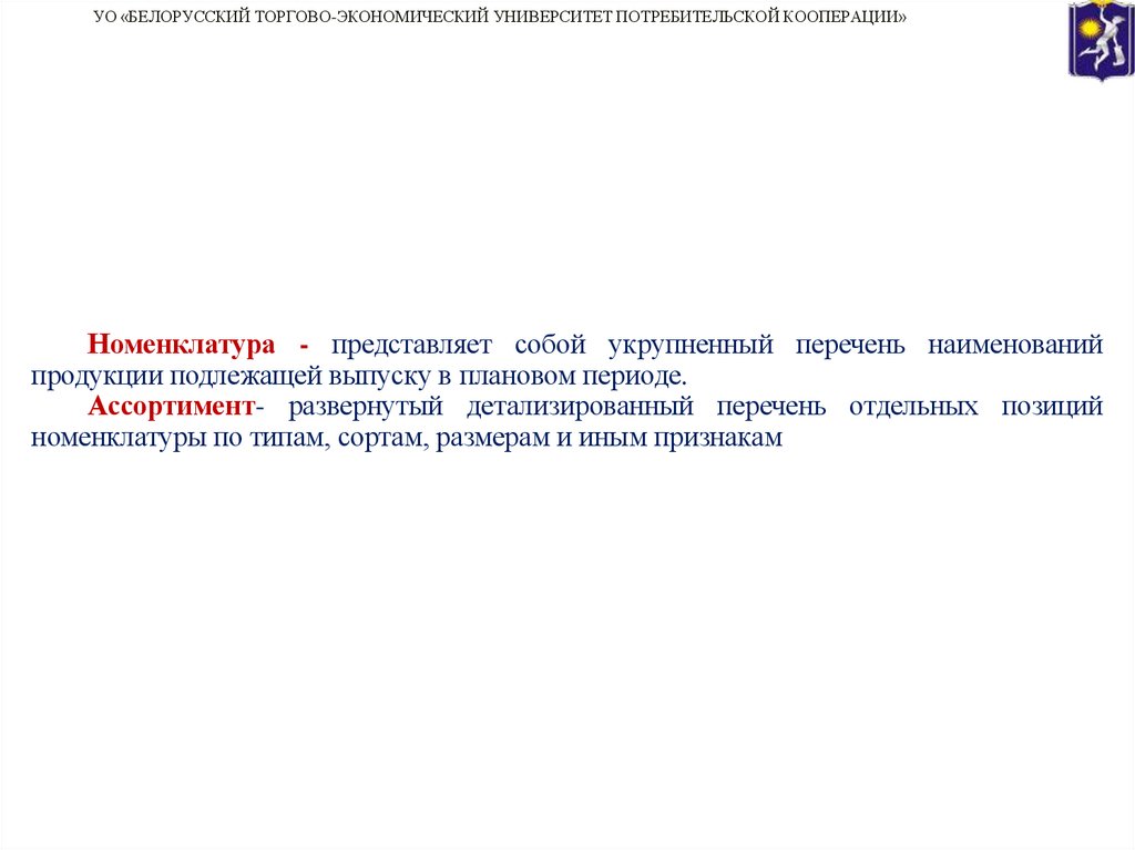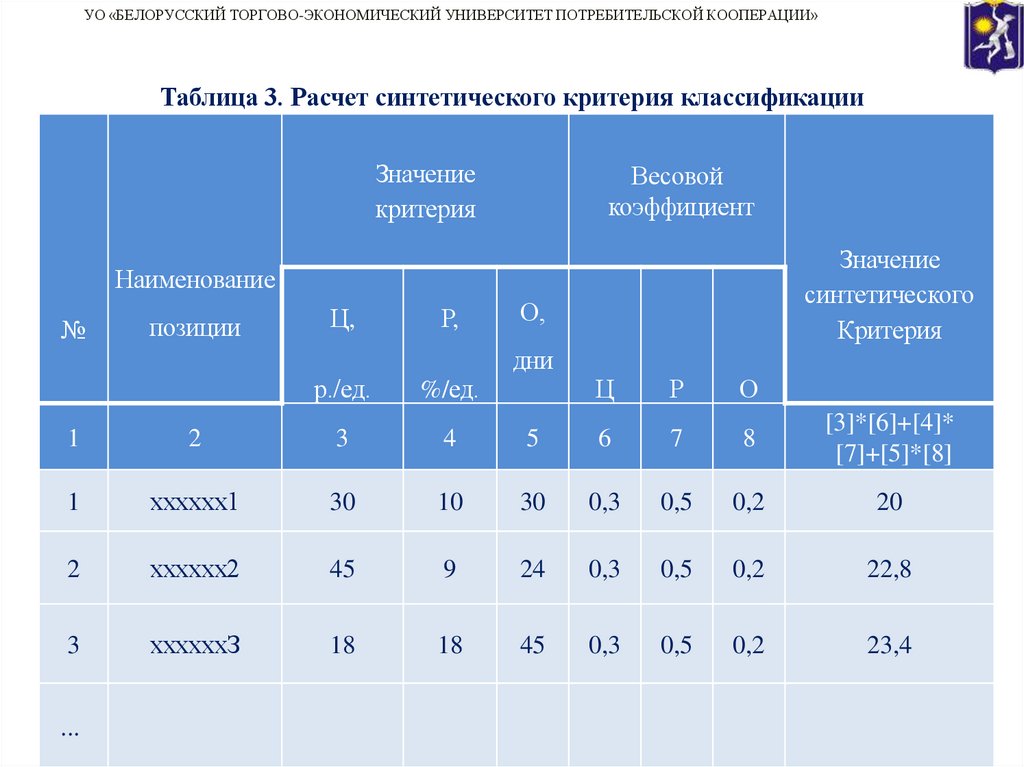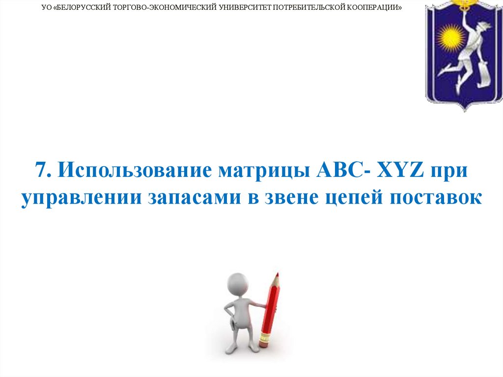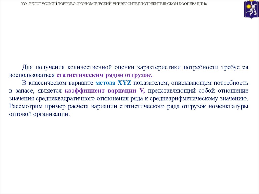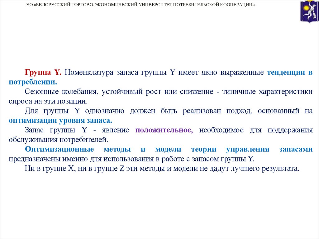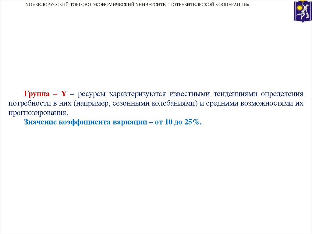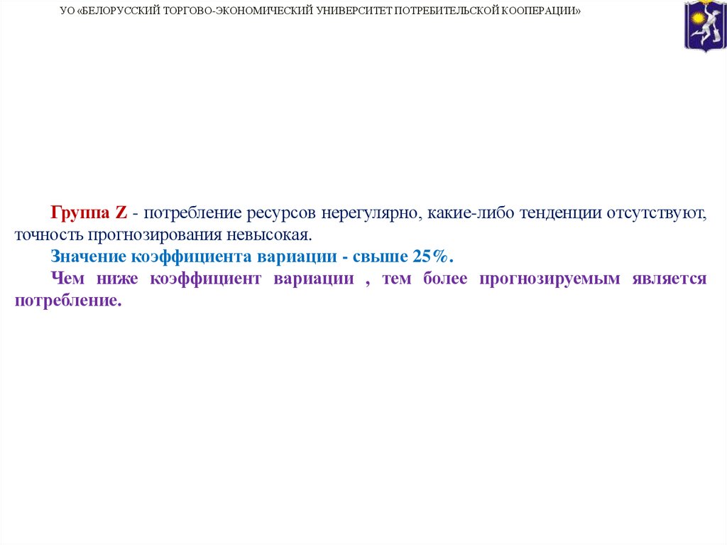 УО «БЕЛОРУССКИЙ ТОРГОВО-ЭКОНОМИЧЕСКИЙ УНИВЕРСИТЕТ ПОТРЕБИТЕЛЬСКОЙ КООПЕРАЦИИ»Классификация АВС требует наличия классификатора номенклатуры запаса.