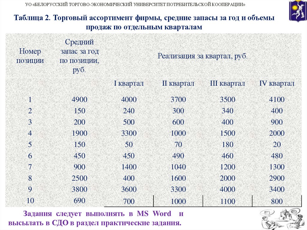 УО «БЕЛОРУССКИЙ ТОРГОВО-ЭКОНОМИЧЕСКИЙ УНИВЕРСИТЕТ ПОТРЕБИТЕЛЬСКОЙ КООПЕРАЦИИ»Таблица 2. Торговый ассортимент фирмы, средние запасы за год и объемы