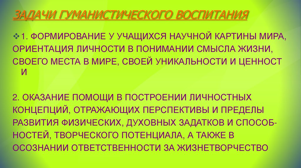 ЗАДАЧИ ГУМАНИСТИЧЕСКОГО ВОСПИТАНИЯ1. ФОРМИРОВАНИЕ У УЧАЩИХСЯ НАУЧНОЙ КАРТИНЫ МИРА,