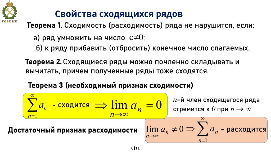 Свойства сходящихся рядовТеорема 1. Сходимость (расходимость) ряда не нарушится, если: