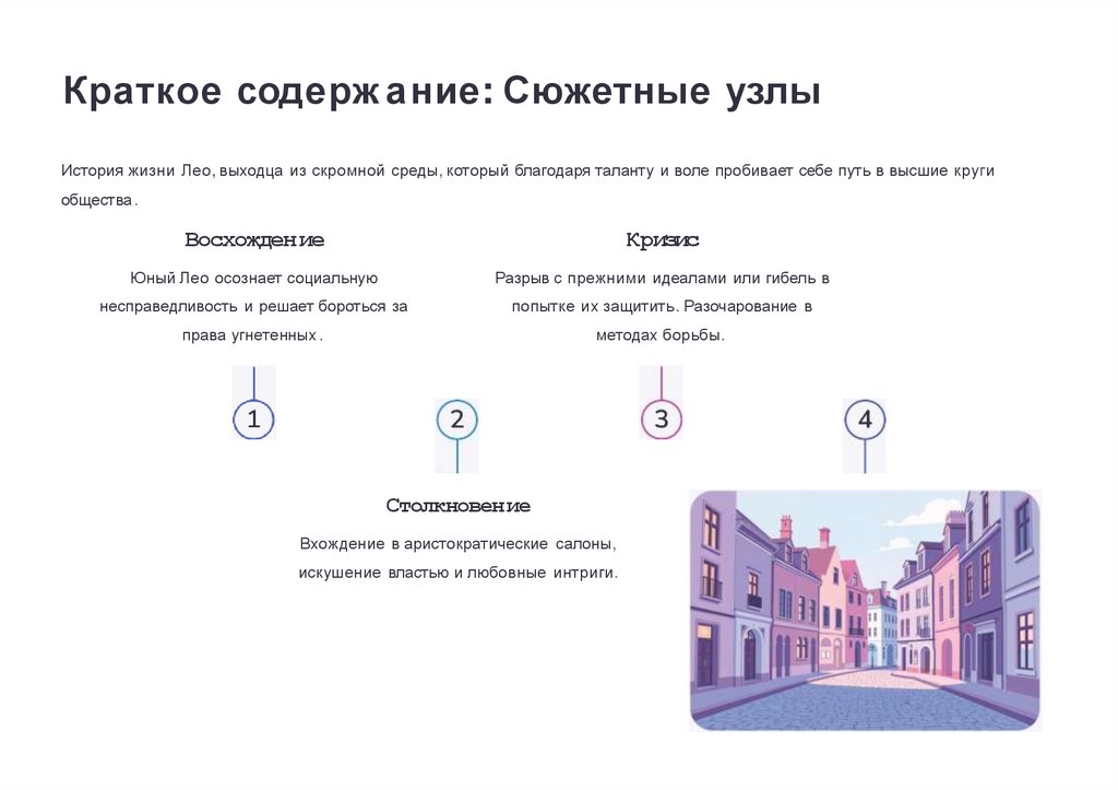 Краткое содерж ание: Сюжетные узлыИстория жизни Лео, выходца из скромной среды, который благодаря таланту и воле пробивает себе путь в высшие круги