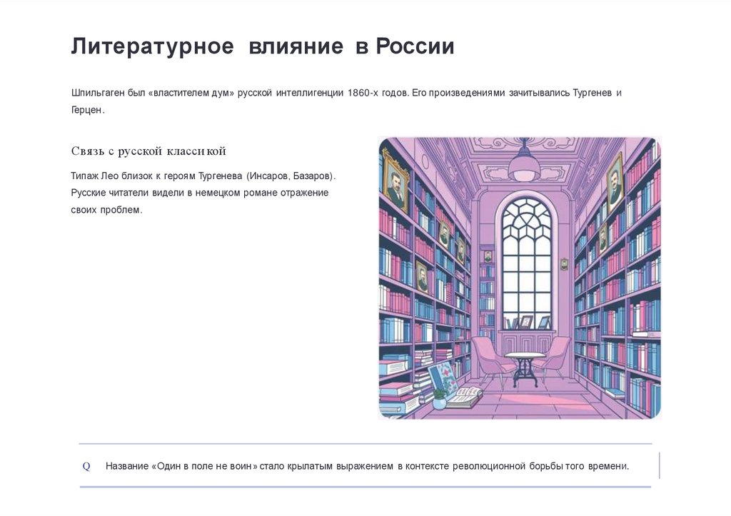 Литературное влияние в РоссииШпильгаген был «властителем дум» русской интеллигенции 1860-х годов. Его произведениями зачитывались Тургенев и
