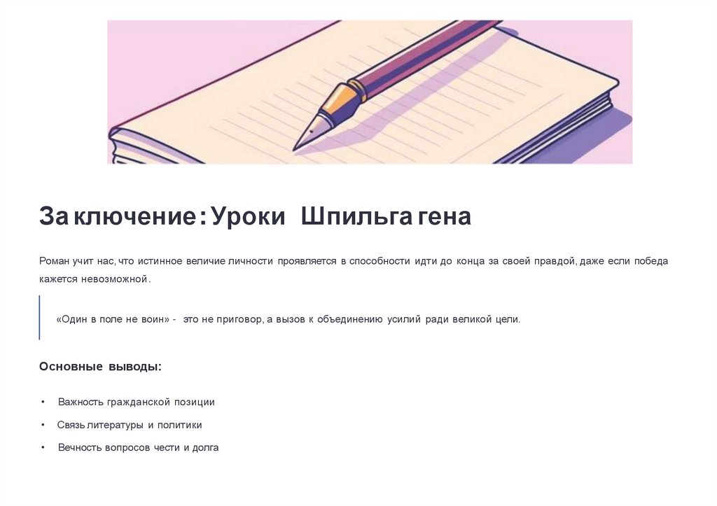 За ключение: Уроки Шпильга генаРоман учит нас, что истинное величие личности проявляется в способности идти до конца за своей правдой, даже если победа