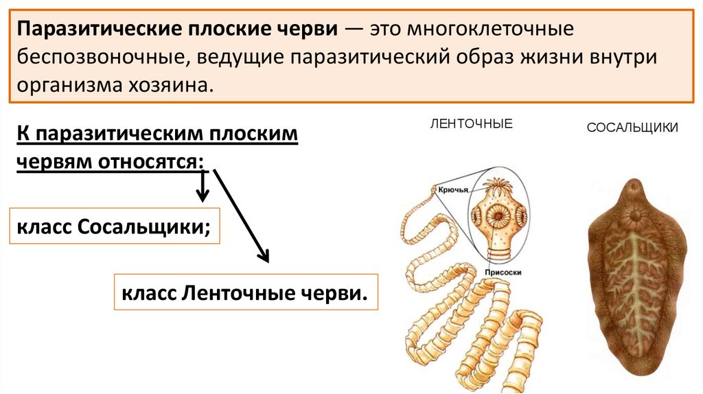 Паразитические плоские черви — это многоклеточныебеспозвоночные, ведущие паразитический образ жизни внутри