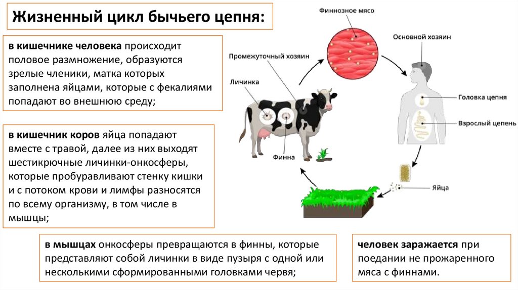 Жизненный цикл бычьего цепня:в кишечнике человека происходит