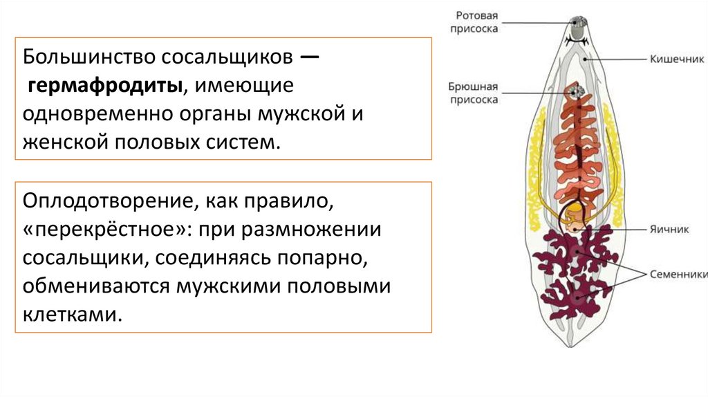 Большинство сосальщиков —гермафродиты, имеющие