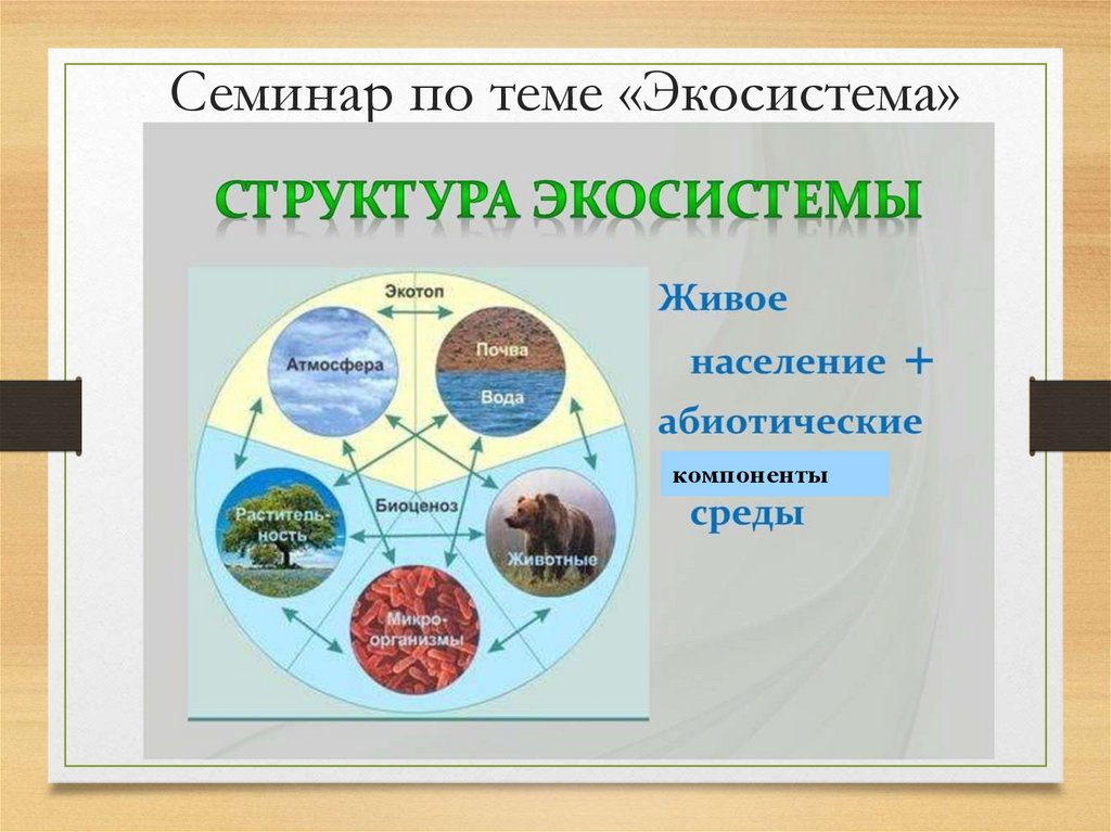 • Компоненты экосистемы – это то, из чего она состоит, а