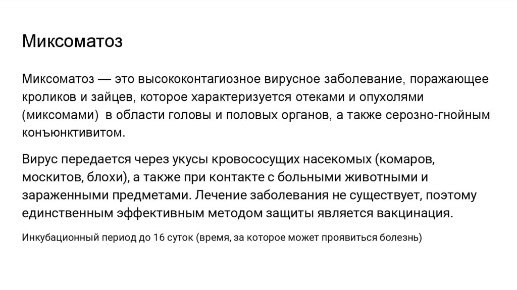 МиксоматозМиксоматоз — это высококонтагиозное вирусное заболевание, поражающее