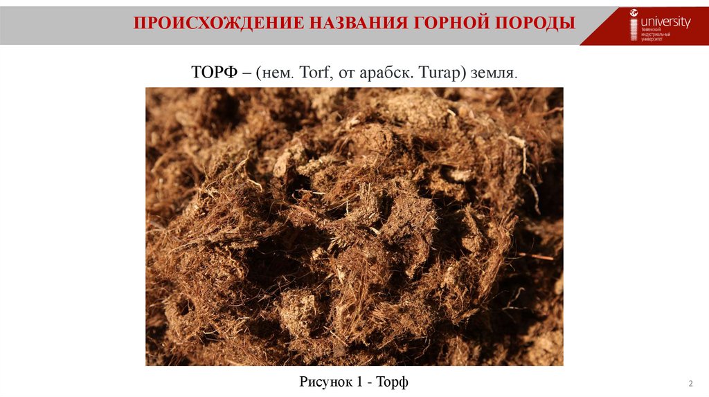 ПРОИСХОЖДЕНИЕ НАЗВАНИЯ ГОРНОЙ ПОРОДЫТОРФ – (нем. Torf, от арабск. Turap) земля.
