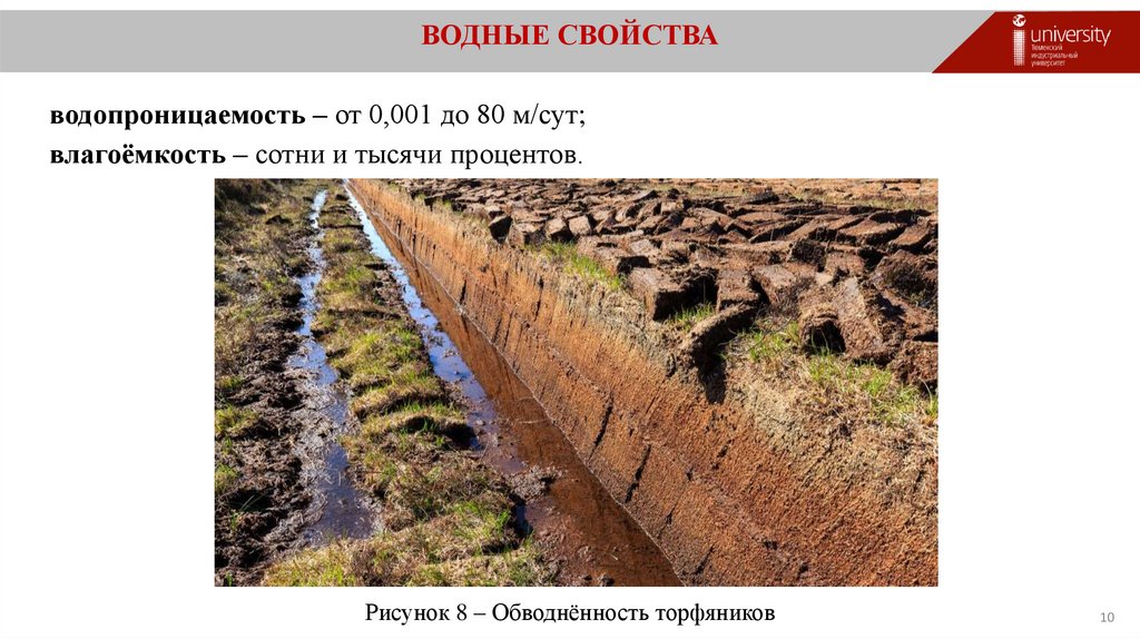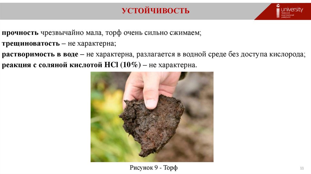 УСТОЙЧИВОСТЬпрочность чрезвычайно мала, торф очень сильно сжимаем;