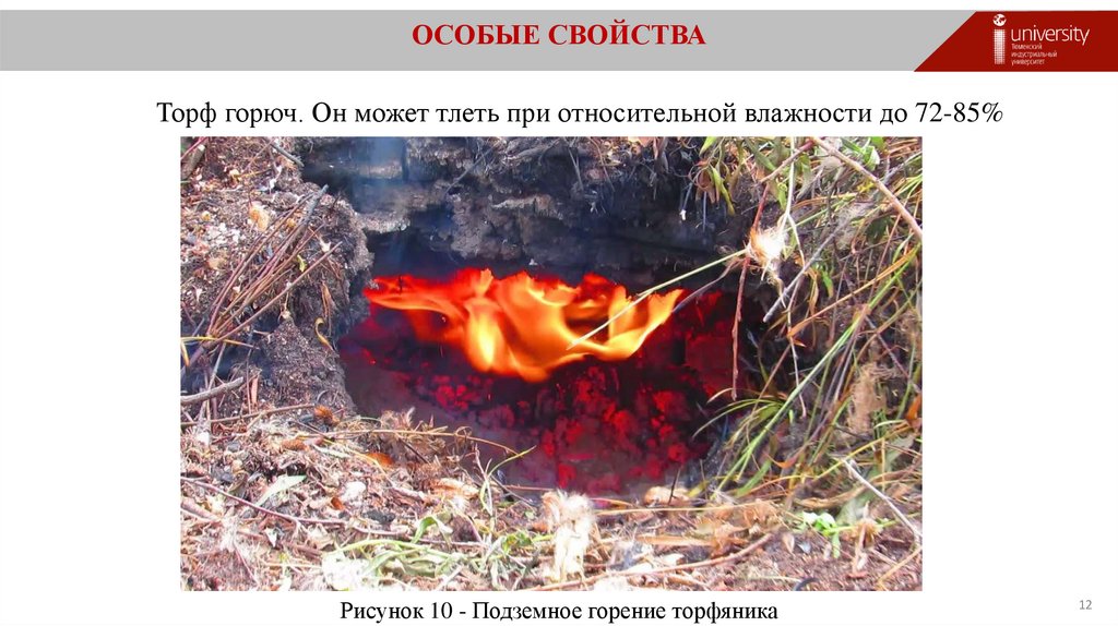 ОСОБЫЕ СВОЙСТВАТорф горюч. Он может тлеть при относительной влажности до 72-85%