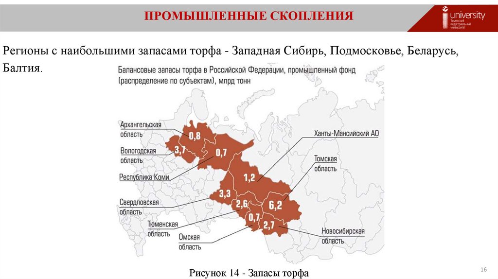 ПРОМЫШЛЕННЫЕ СКОПЛЕНИЯРегионы с наибольшими запасами торфа - Западная Сибирь, Подмосковье, Беларусь,