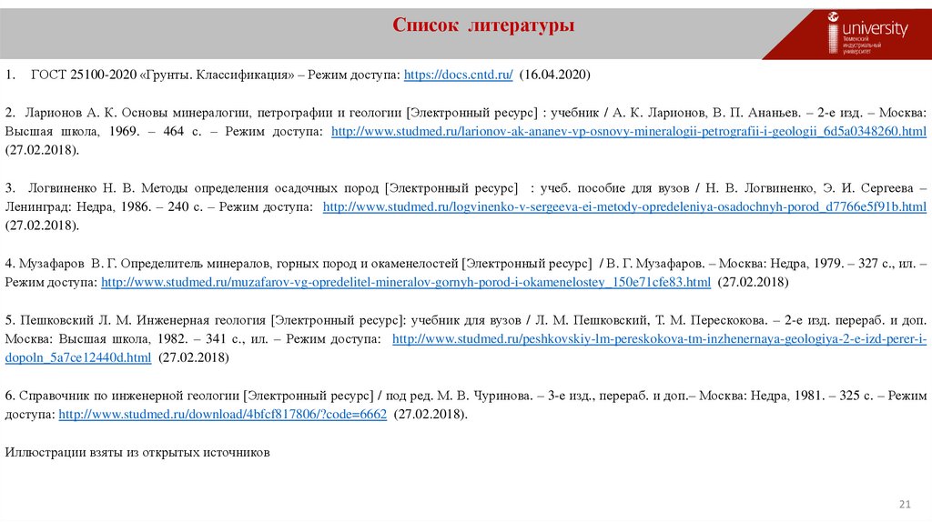 ГОСТ 25100-2020 «Грунты. Классификация» – Режим доступа: https://docs.cntd.ru/ (16.04.2020)