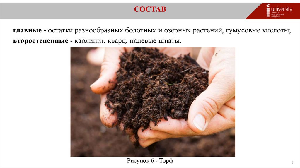 СОСТАВглавные - остатки разнообразных болотных и озёрных растений, гумусовые кислоты;
