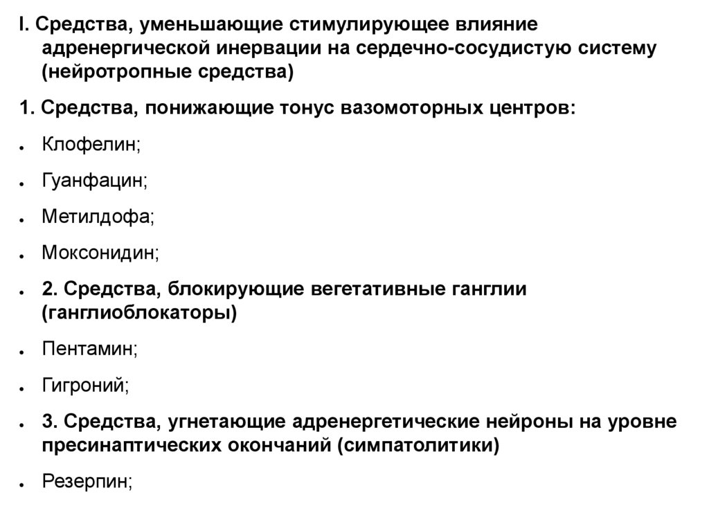 I. Средства, уменьшающие стимулирующее влияниеадренергической инервации на сердечно-сосудистую систему