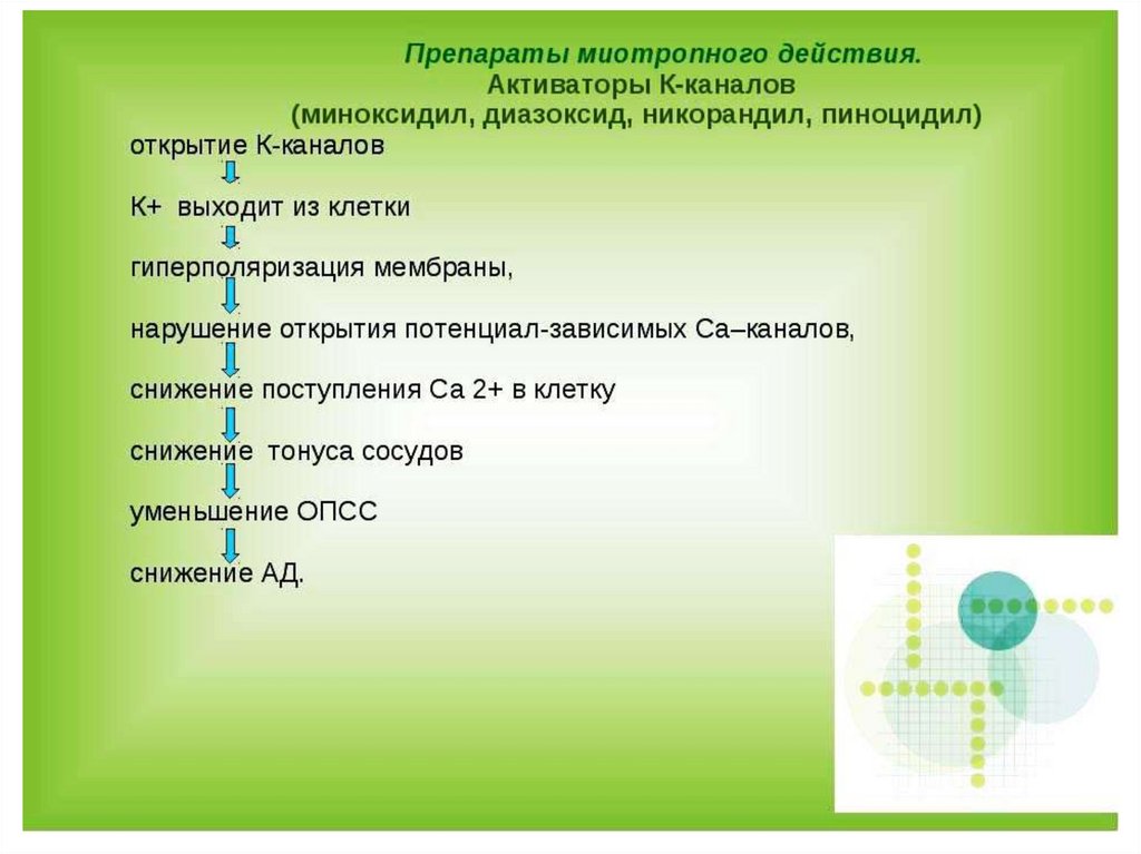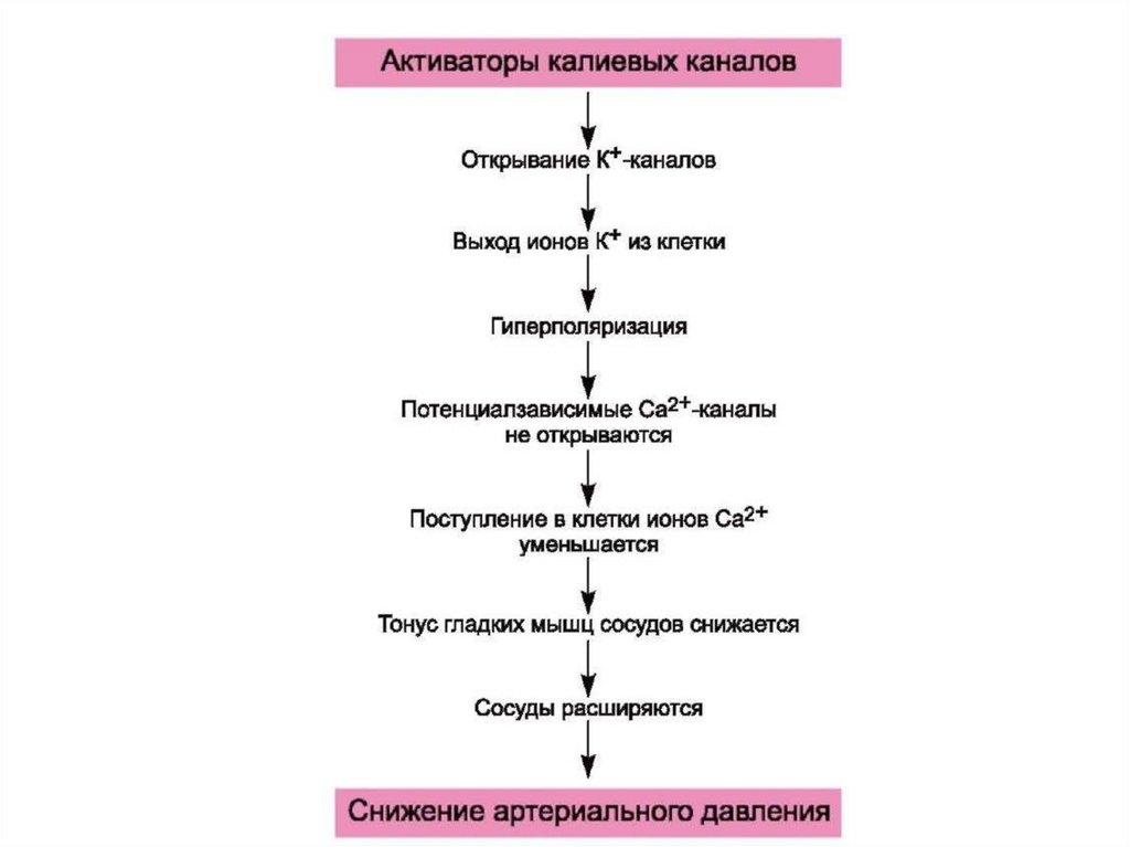 активаторов калиевых каналов. Активаторы калиевых каналов Открывание К+-каналов - Выход ионов К+ из клетки –