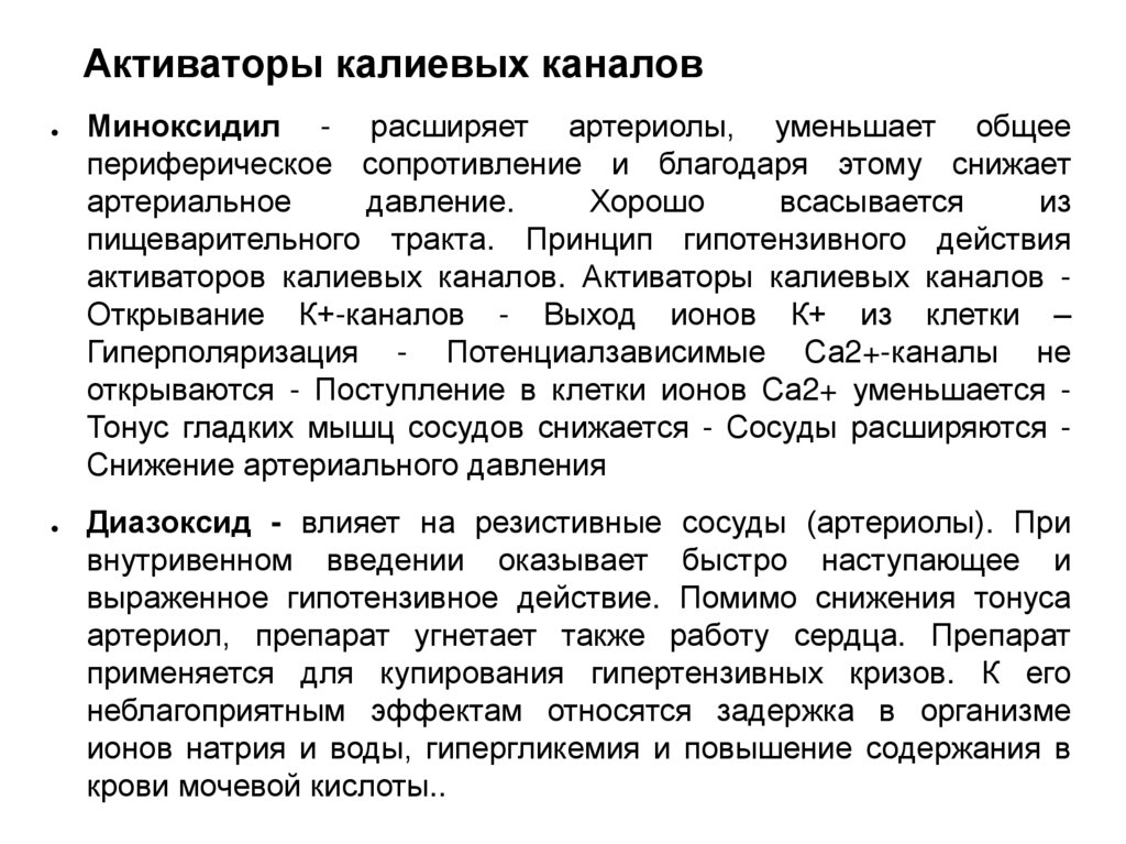 Активаторы калиевых каналовМиноксидил - расширяет артериолы, уменьшает общее
