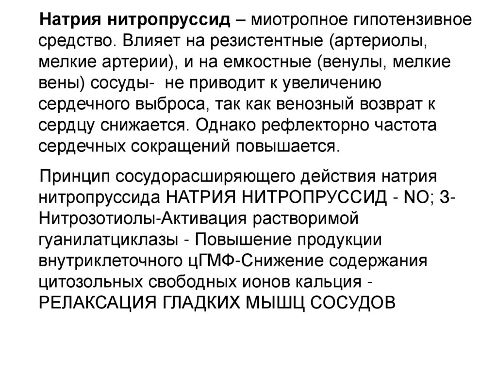 Натрия нитропруссид – миотропное гипотензивноесредство. Влияет на резистентные (артериолы,