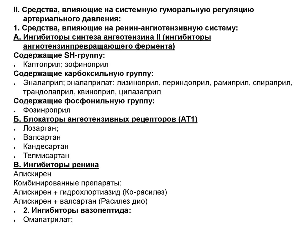 II. Средства, влияющие на системную гуморальную регуляциюартериального давления: