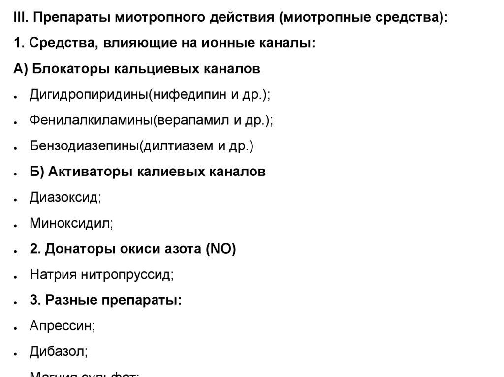 III. Препараты миотропного действия (миотропные средства):1. Средства, влияющие на ионные каналы: