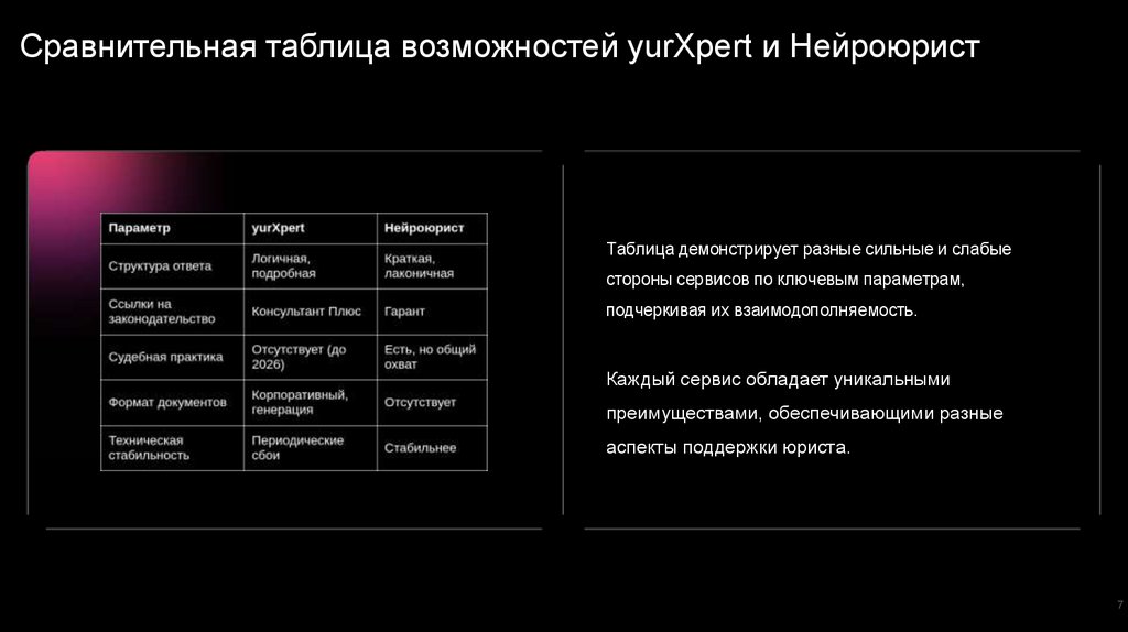 Сравнительная таблица возможностей yurXpert и НейроюристТаблица демонстрирует разные сильные и слабые