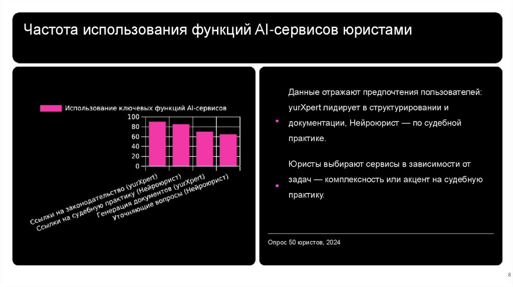Частота использования функций AI-сервисов юристамиДанные отражают предпочтения пользователей: