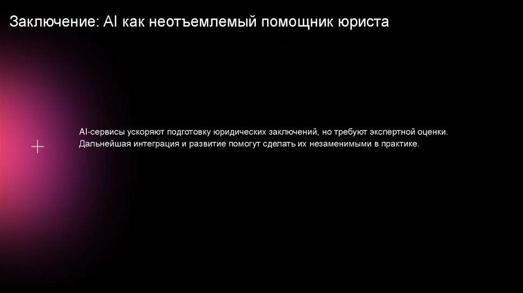 Заключение: AI как неотъемлемый помощник юристаAI-сервисы ускоряют подготовку юридических заключений, но требуют экспертной оценки.