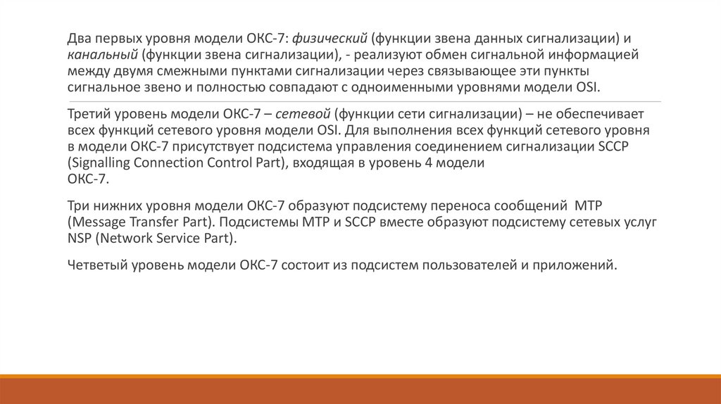 Два первых уровня модели ОКС-7: физический (функции звена данных сигнализации) иканальный (функции звена сигнализации), - реализуют обмен сигнальной информацией
