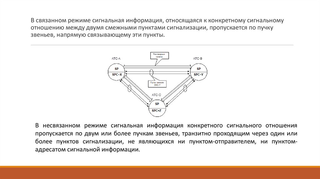 В связанном режиме сигнальная информация, относящаяся к конкретному сигнальномуотношению между двумя смежными пунктами сигнализации, пропускается по пучку